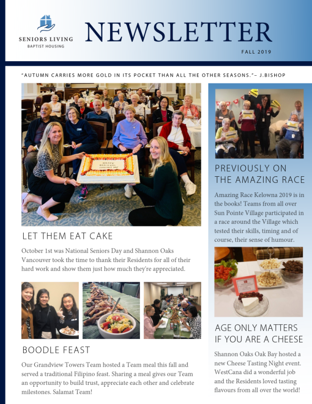 Fall is a busy season - be sure to read our newsletter to find out everything that has been happening in our communities. Our Residents were honoured during National Seniors Day and they also baked the world a better place at Mill Creek Village. It's Fall at Baptist Housing and we have so much to be thankful for. Don't miss out on our Boodle Feast challenge!